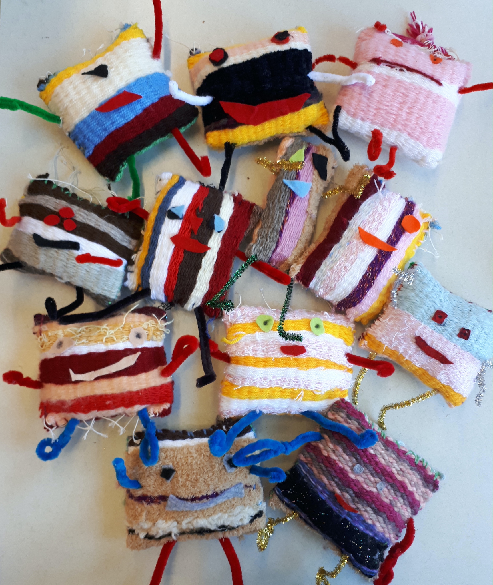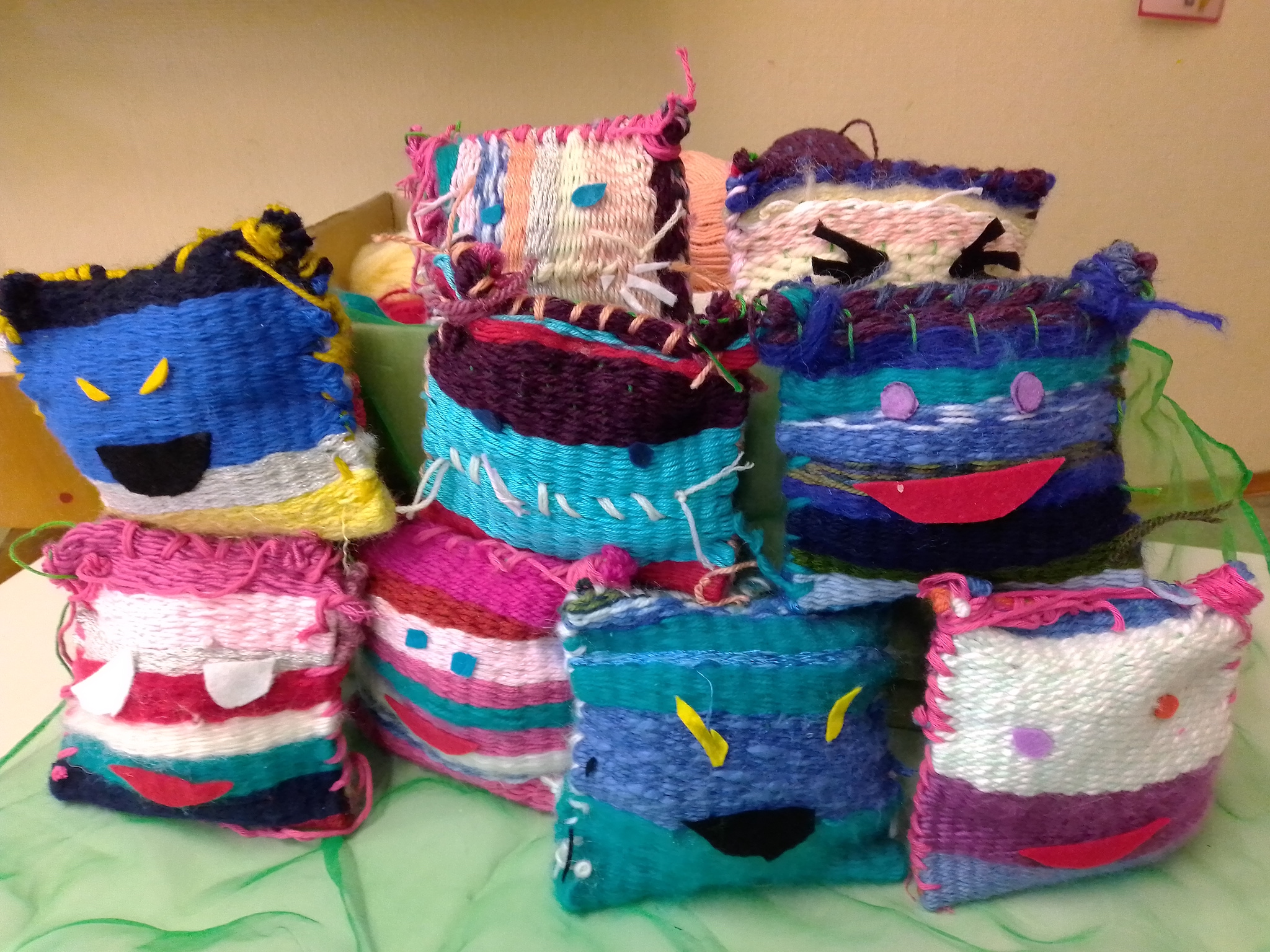 Die Kinder der 2. Klassen haben in den letzten Wochen im Rahmen des Kunst- und Werkunterrichts fleißig an einem Monsterprojekt gearbeitet. Ziel war es, ein kleines Monsterchen aus Wolle und Filz herzustellen. Dazu webten die Kinder zunächst mit Hilfe eines Webrahmens ein Rechteck. Schon bei dieser Arbeit waren die Schülerinnen und Schüler mit viel Spaß und Begeisterung dabei und verwirklichten in der Gestaltung erste eigene Vorstellungen. Nach diesem Arbeitsschritt übten sie sich im Nähen - das Rechteck wurde an den Seiten geschlossen und mit Watte gefüllt.
